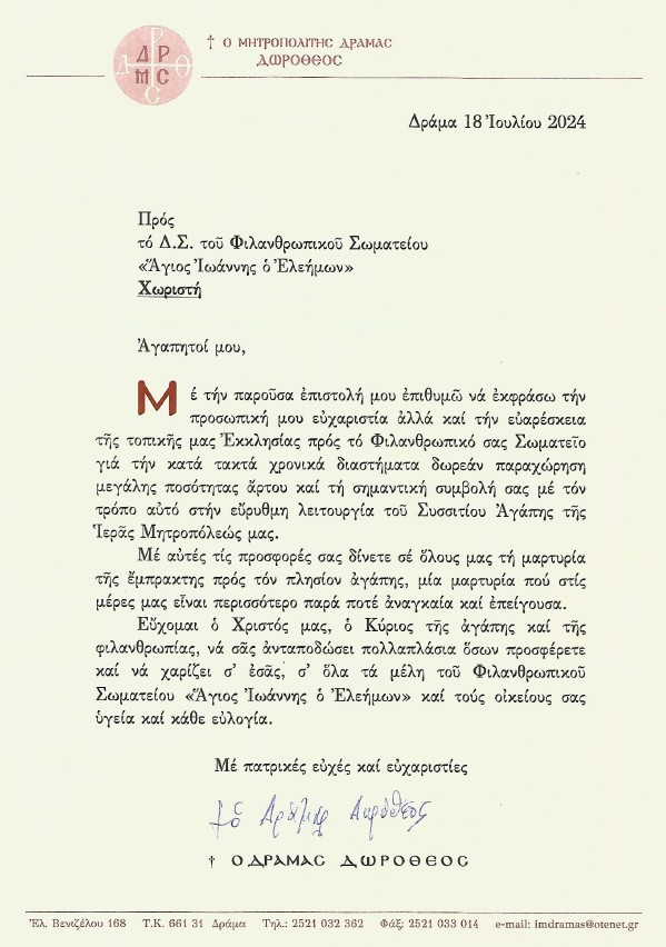 2024 – ΕΥΧΑΡΙΣΤΗΡΙΑ ΕΠΙΣΤΟΛΗ ΜΗΤΡΟΠΟΛIΤΗ